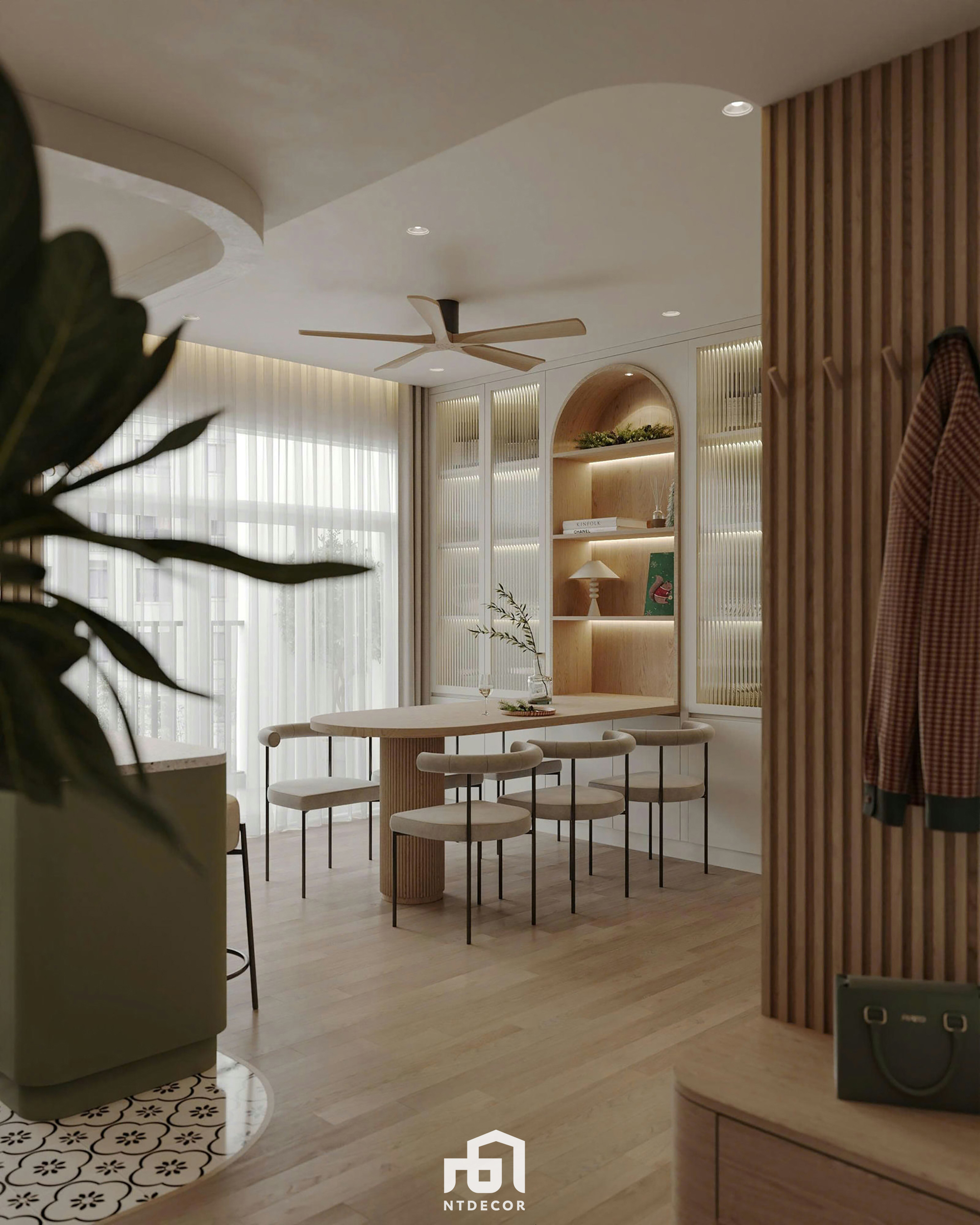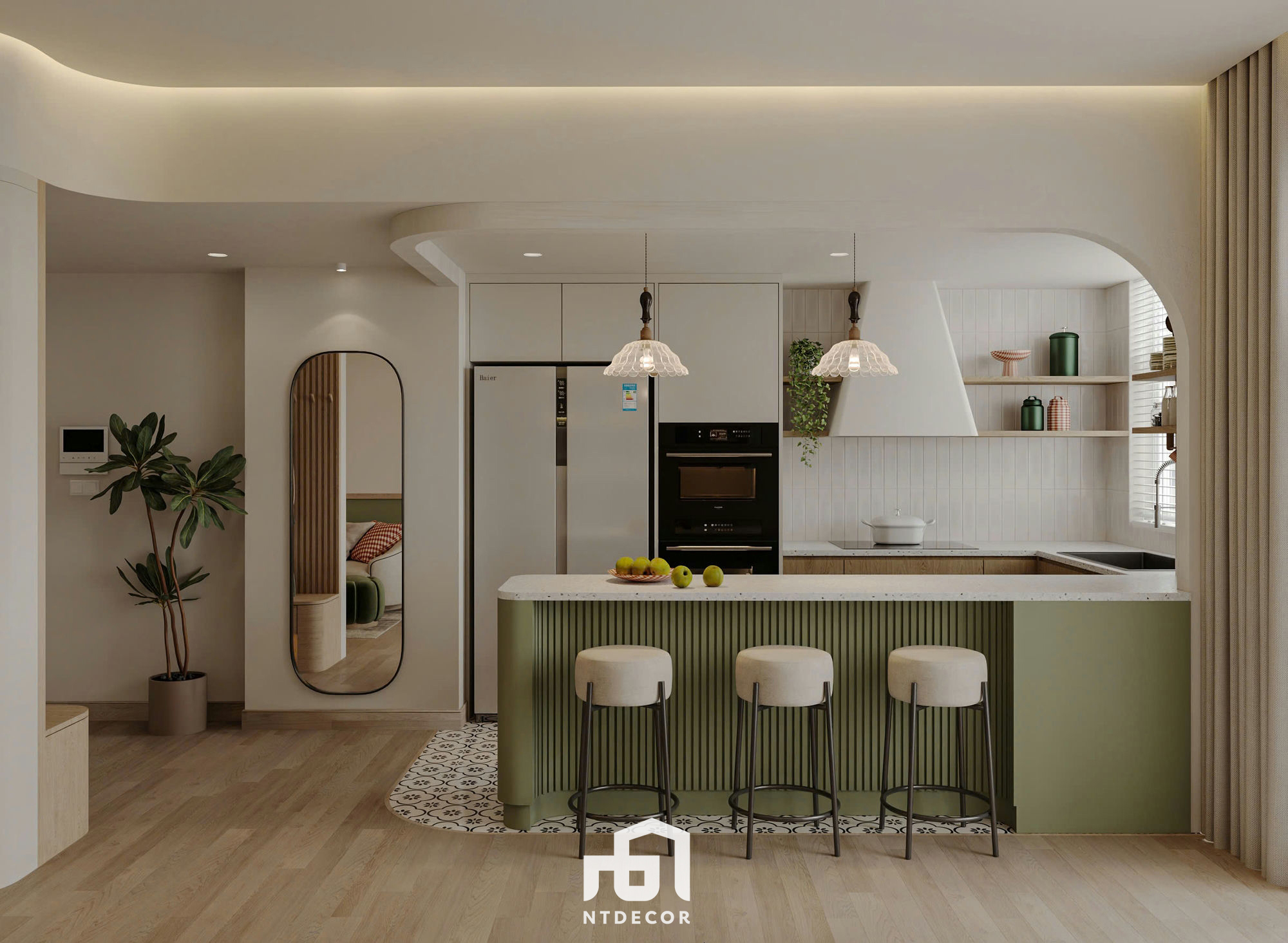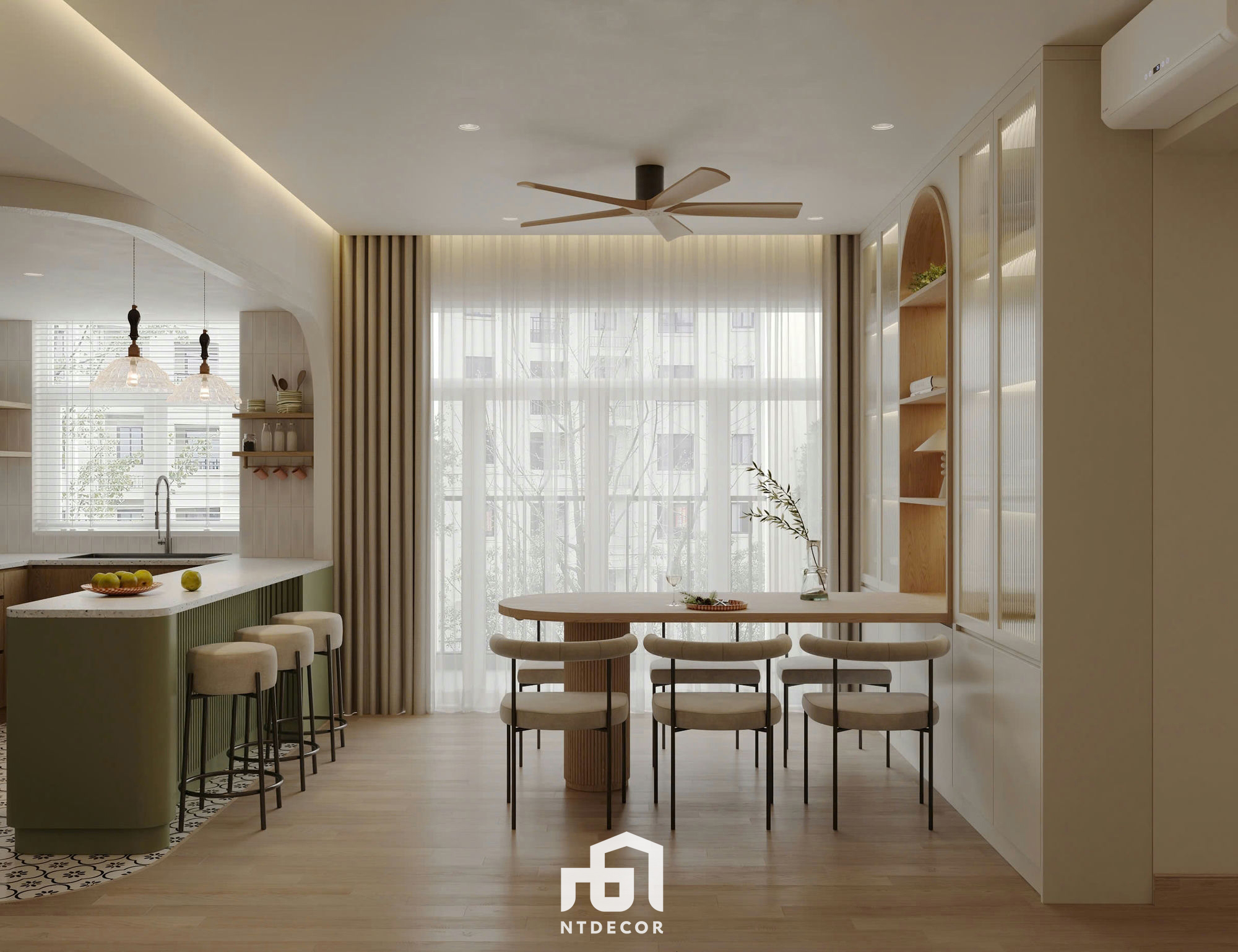 Kitchen Island and Dining Set: The kitchen island, clad in prominent fluted moss-green paneling, stands out against the backdrop of soft patterned mosaic tiles, subtly differentiating it from the wooden flooring. The oval dining table with a large ribbed pedestal base and the beige upholstered dining chairs with curved backs form a coherent and cozy ensemble.