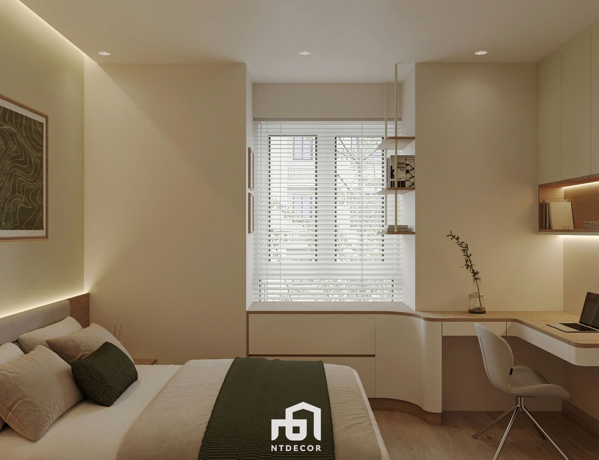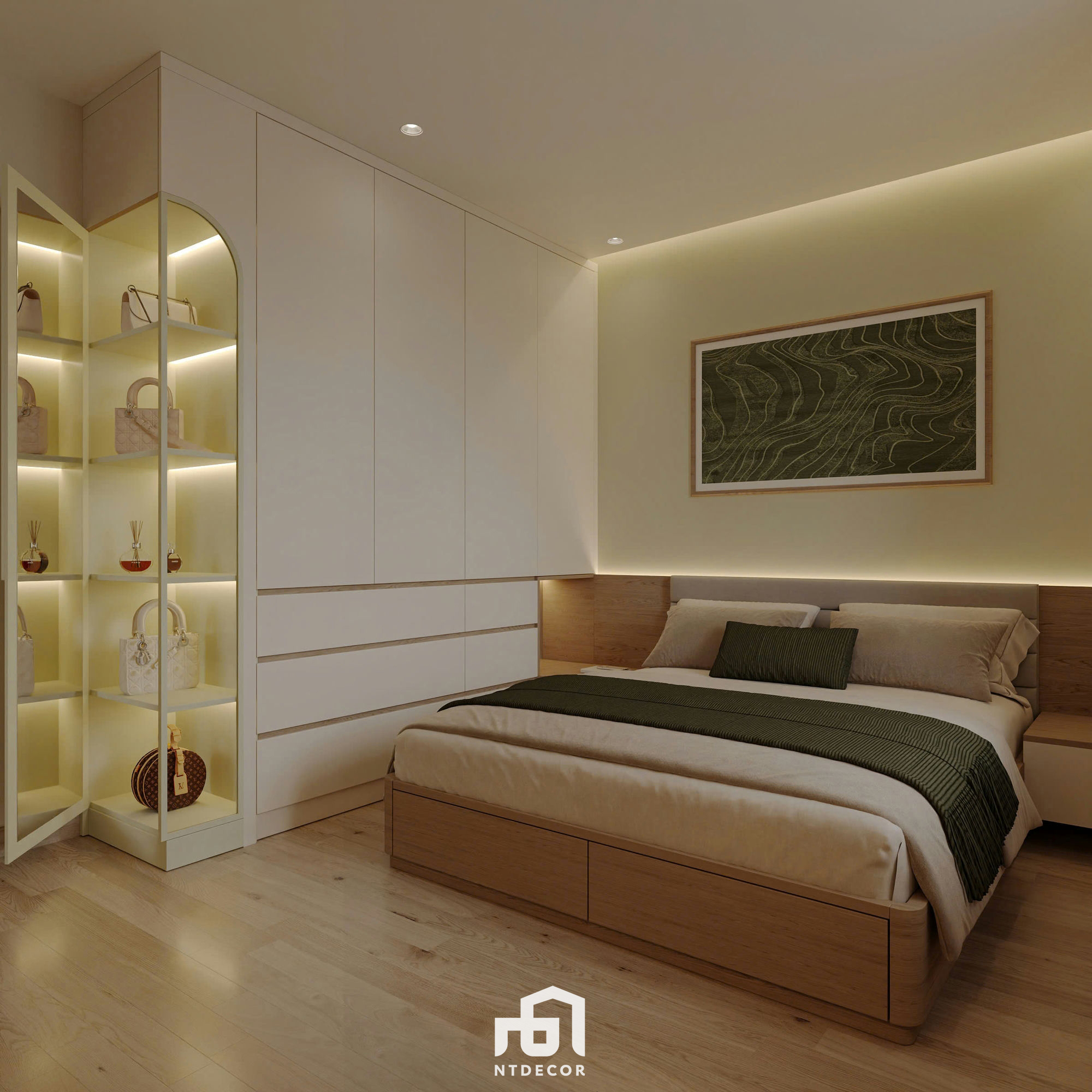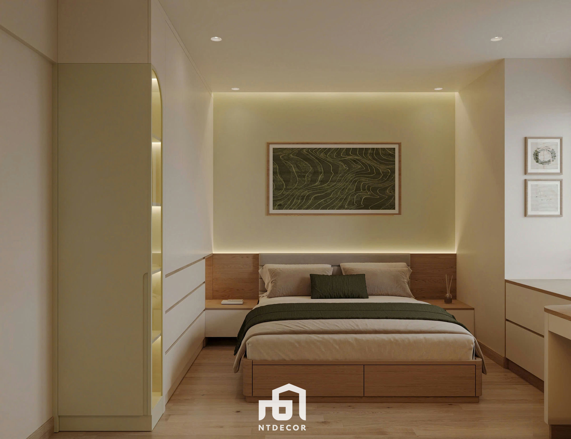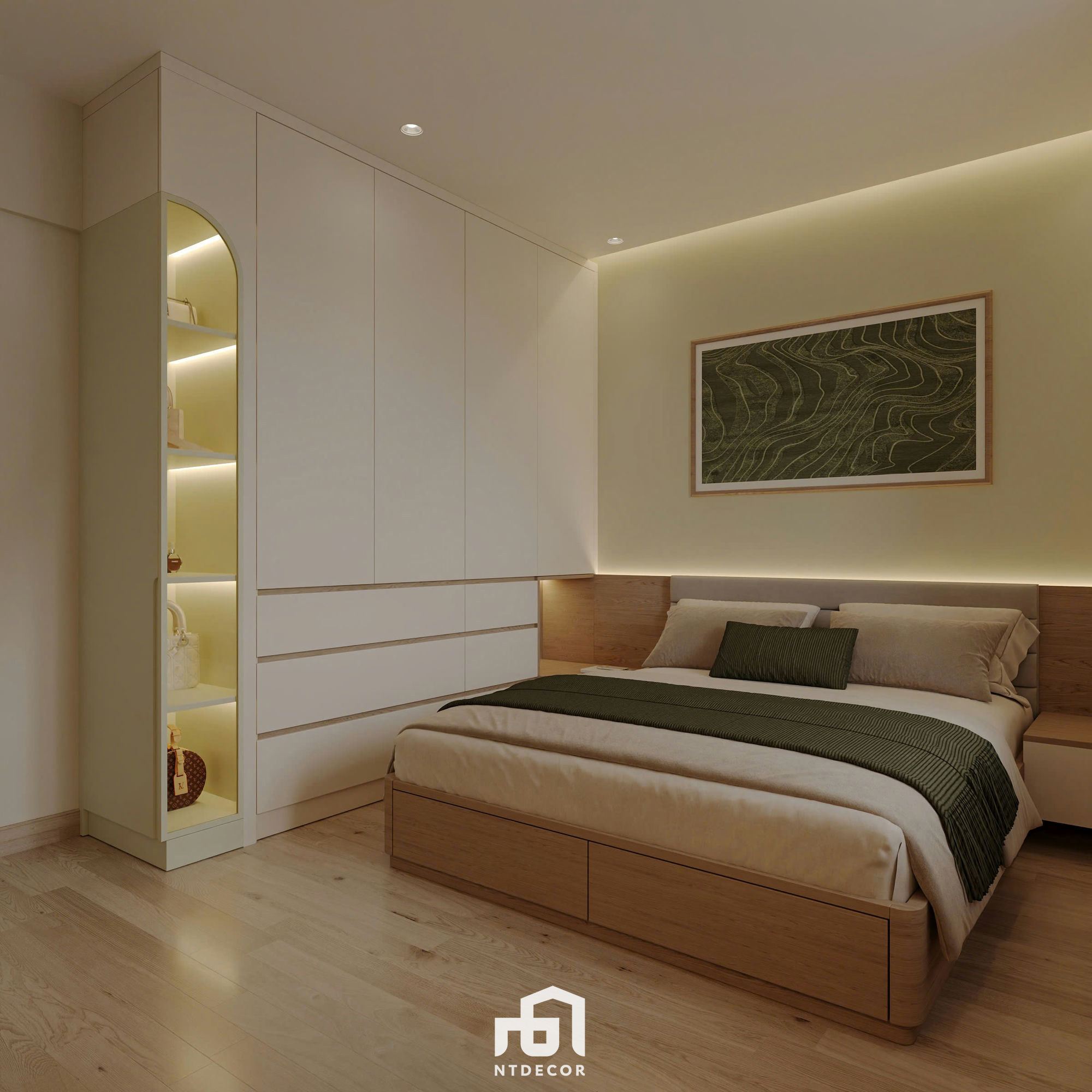 Cozy Comfort: The bed features a wooden platform base with drawers, combined with a wood-paneled headboard and gentle light casting from the ceiling cove (the continuous strip lighting creates a visual effect). The wall behind the headboard is painted in a khaki/light yellow hue, promoting complete tranquility.
