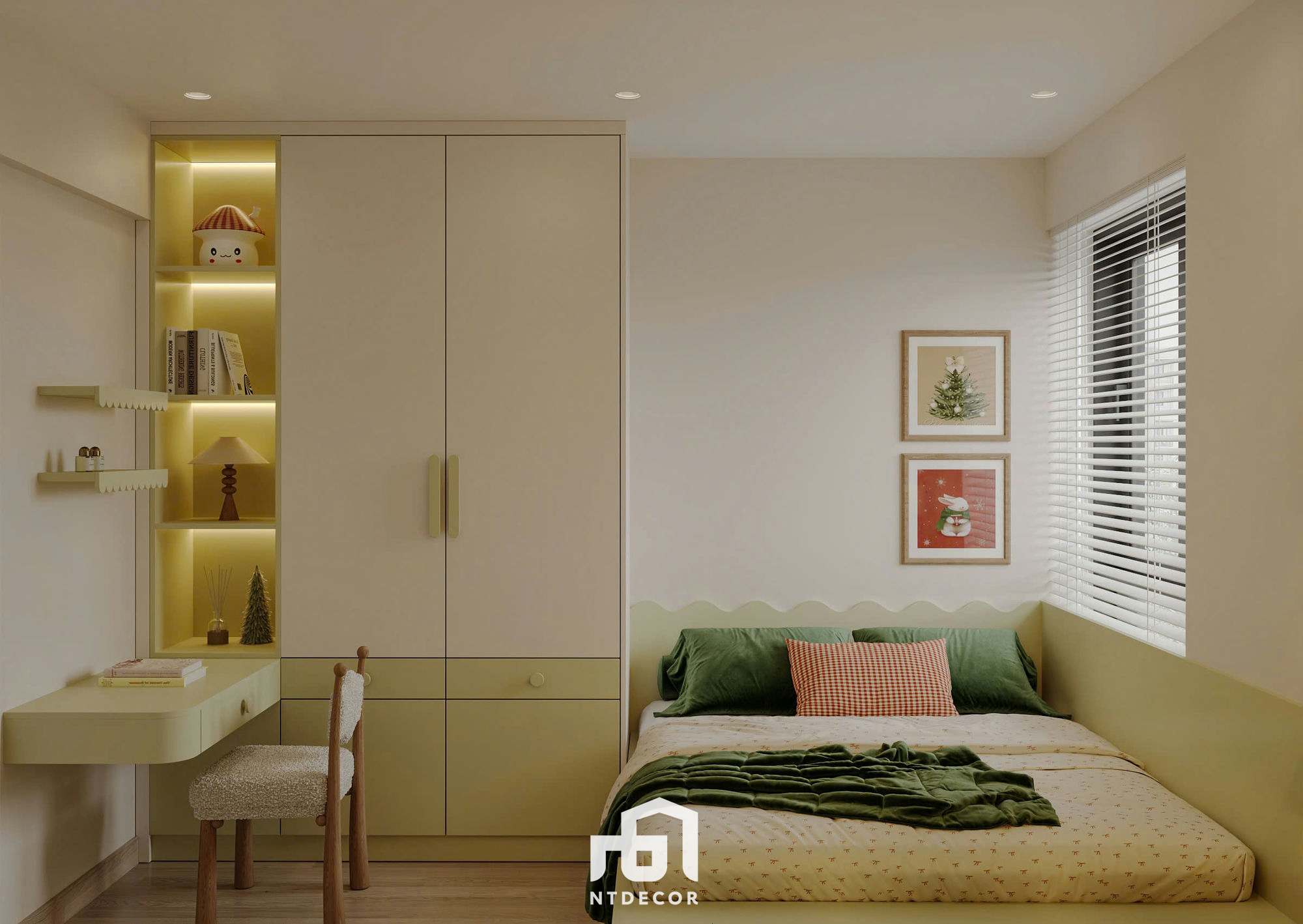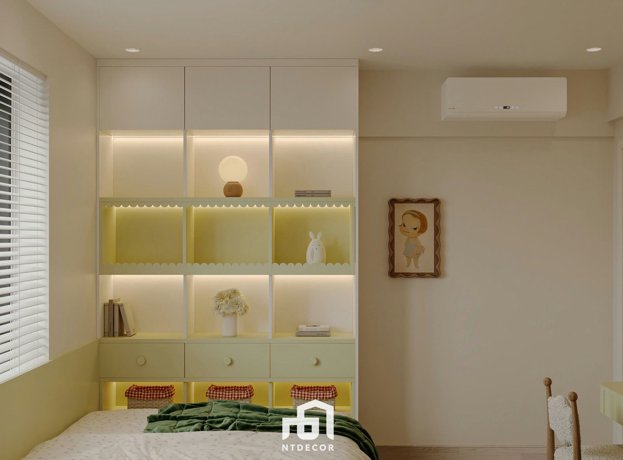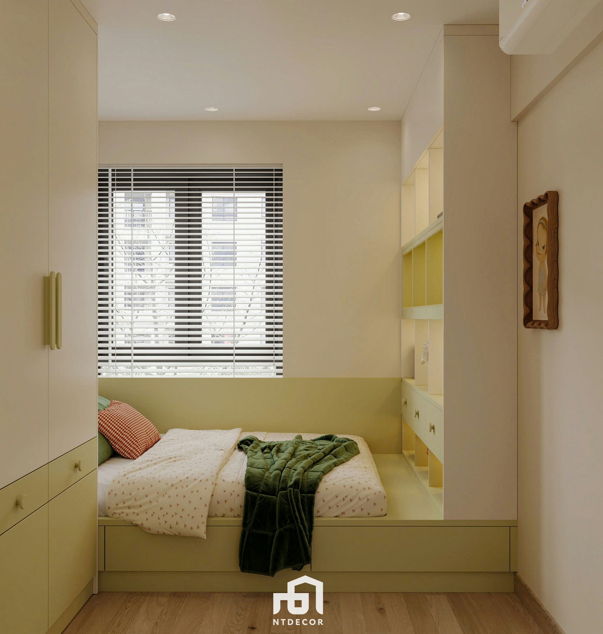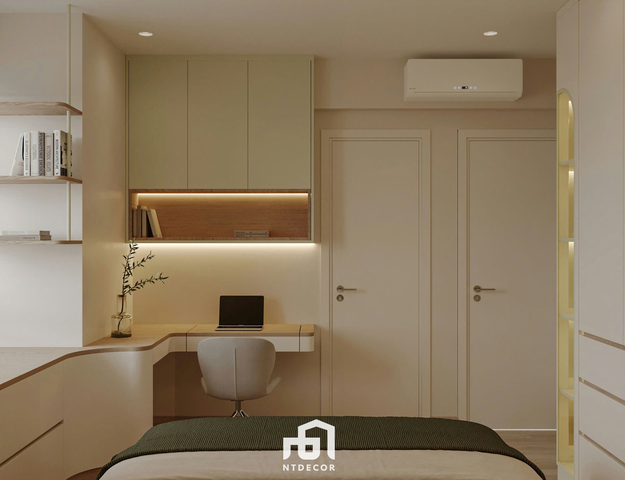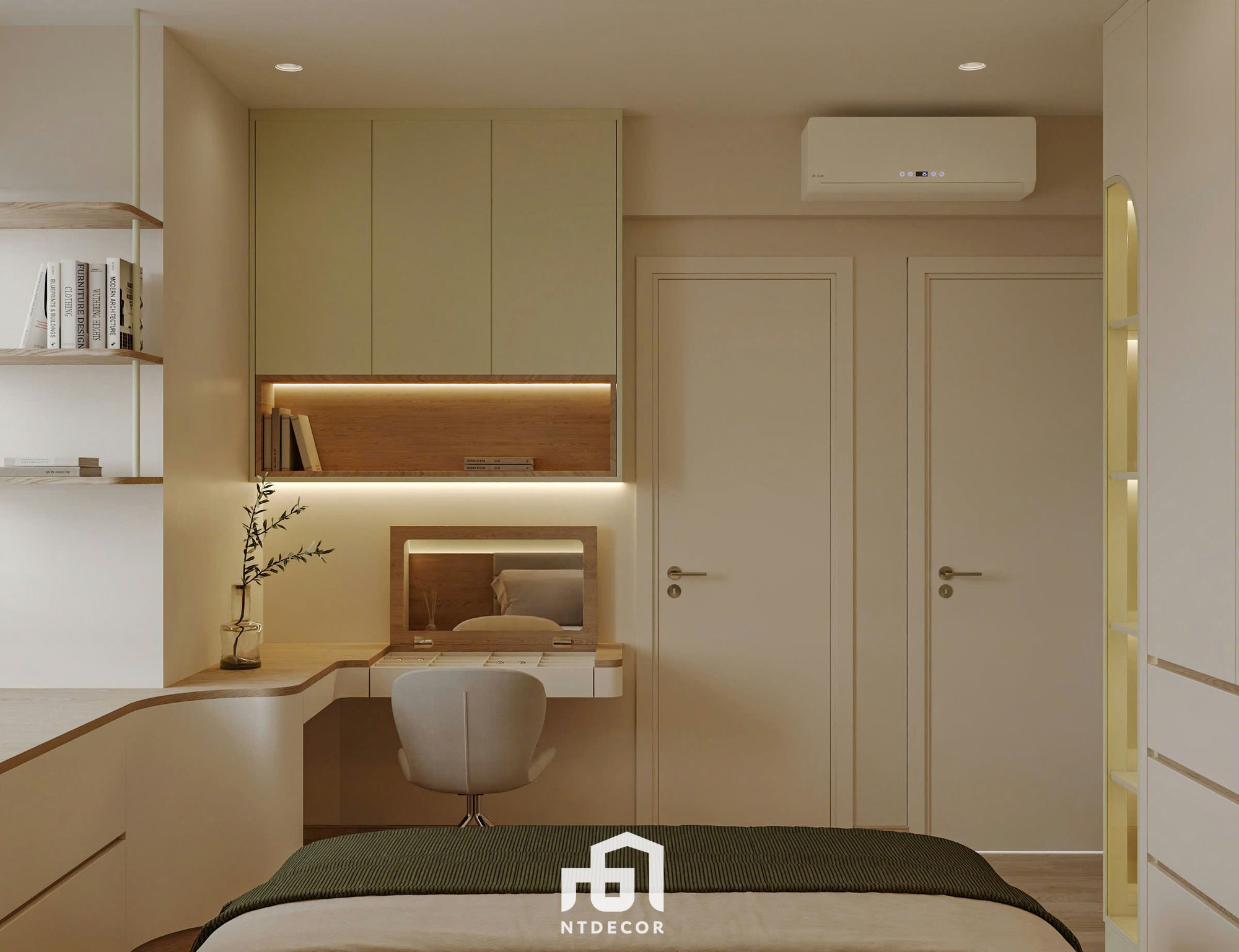 Cozy Comfort: The bed features a wooden platform base with drawers, combined with a wood-paneled headboard and gentle light casting from the ceiling cove (the continuous strip lighting creates a visual effect). The wall behind the headboard is painted in a khaki/light yellow hue, promoting complete tranquility.