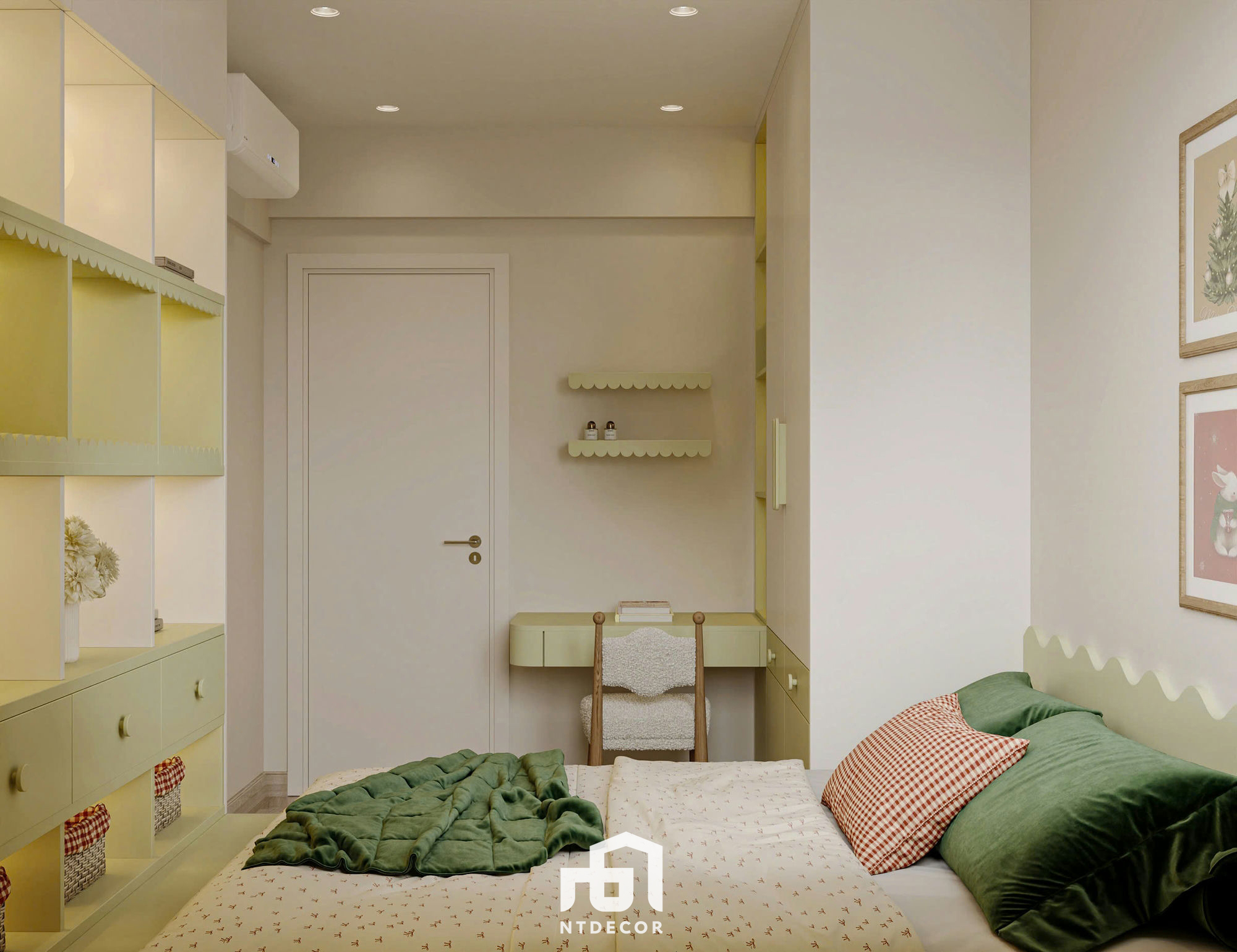 TV Area: The TV wall is designed as a smooth panel, integrating hidden cabinets, and a small illuminated niche for decor, ensuring the space remains tidy and aesthetically pleasing.