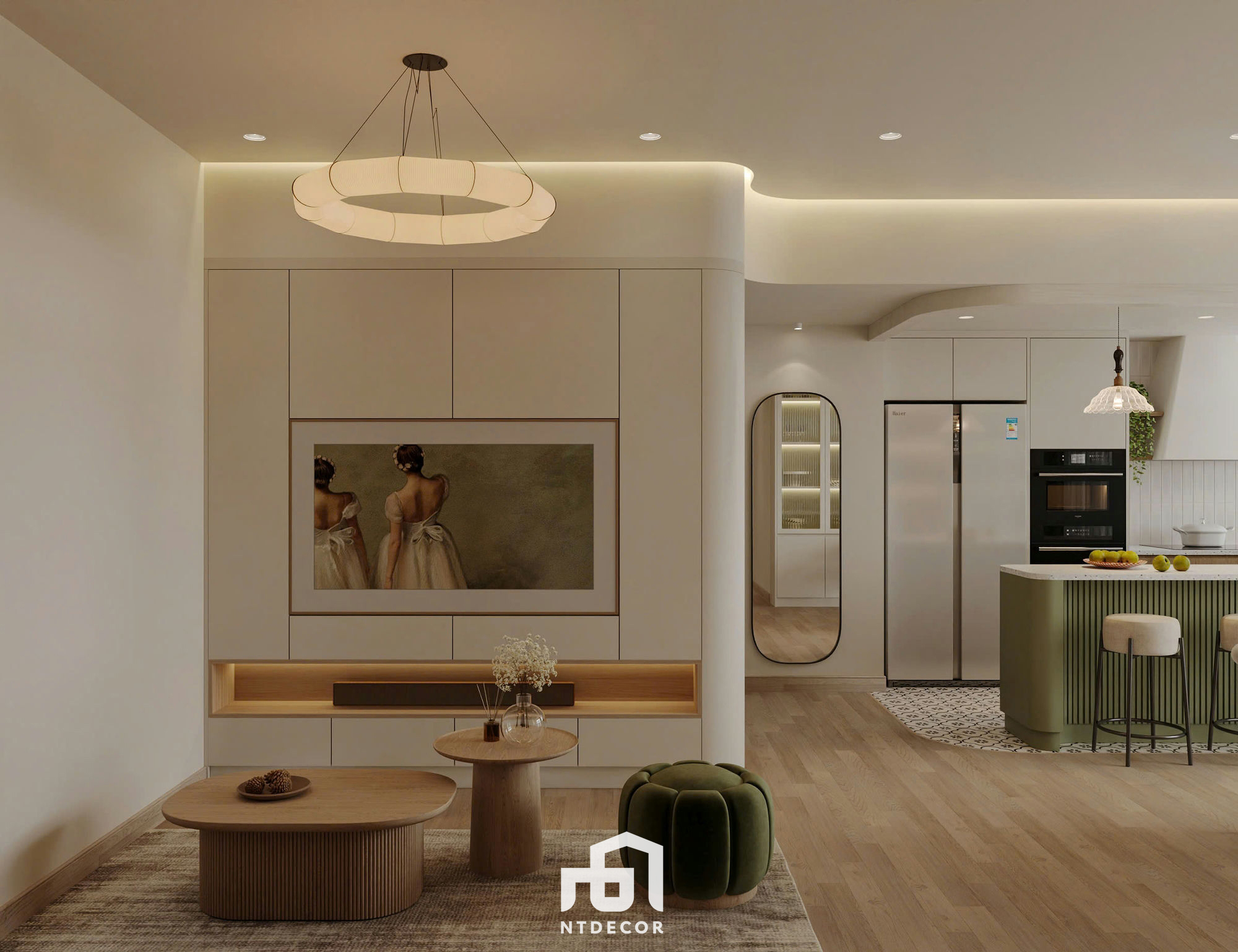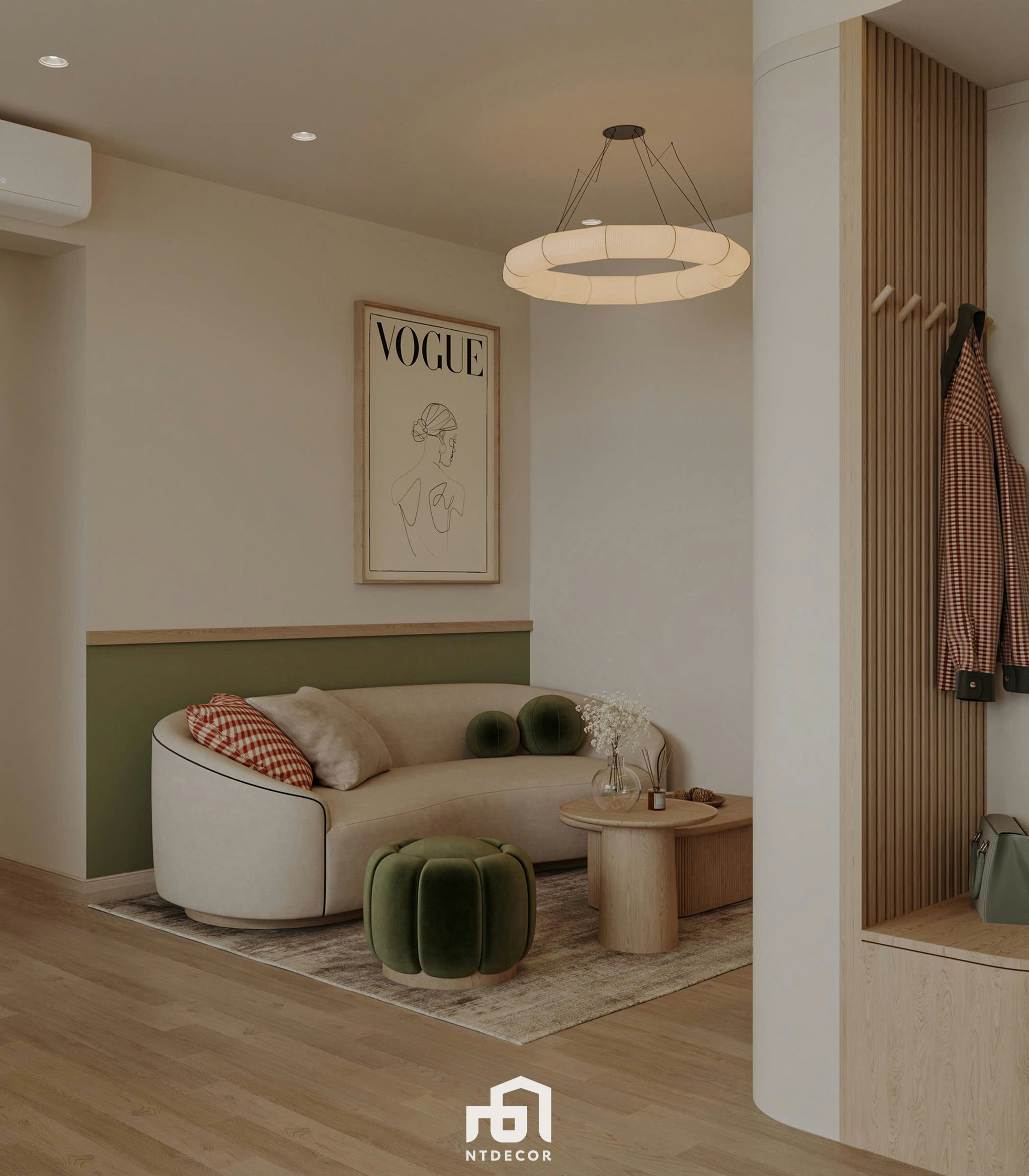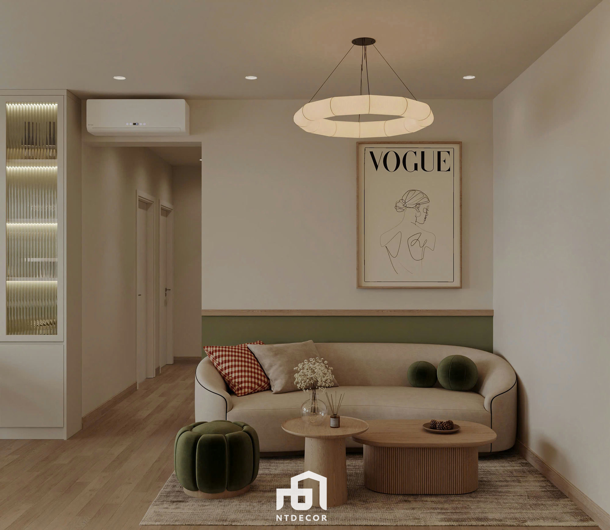 The Focal Point: A softly curved sofa upholstered in cream fabric harmoniously paired with twin wooden coffee tables featuring sophisticated ribbed pedestal bases. The visual highlights include a velvet olive-green ottoman and a gentle olive-green painted wall section behind the sofa.