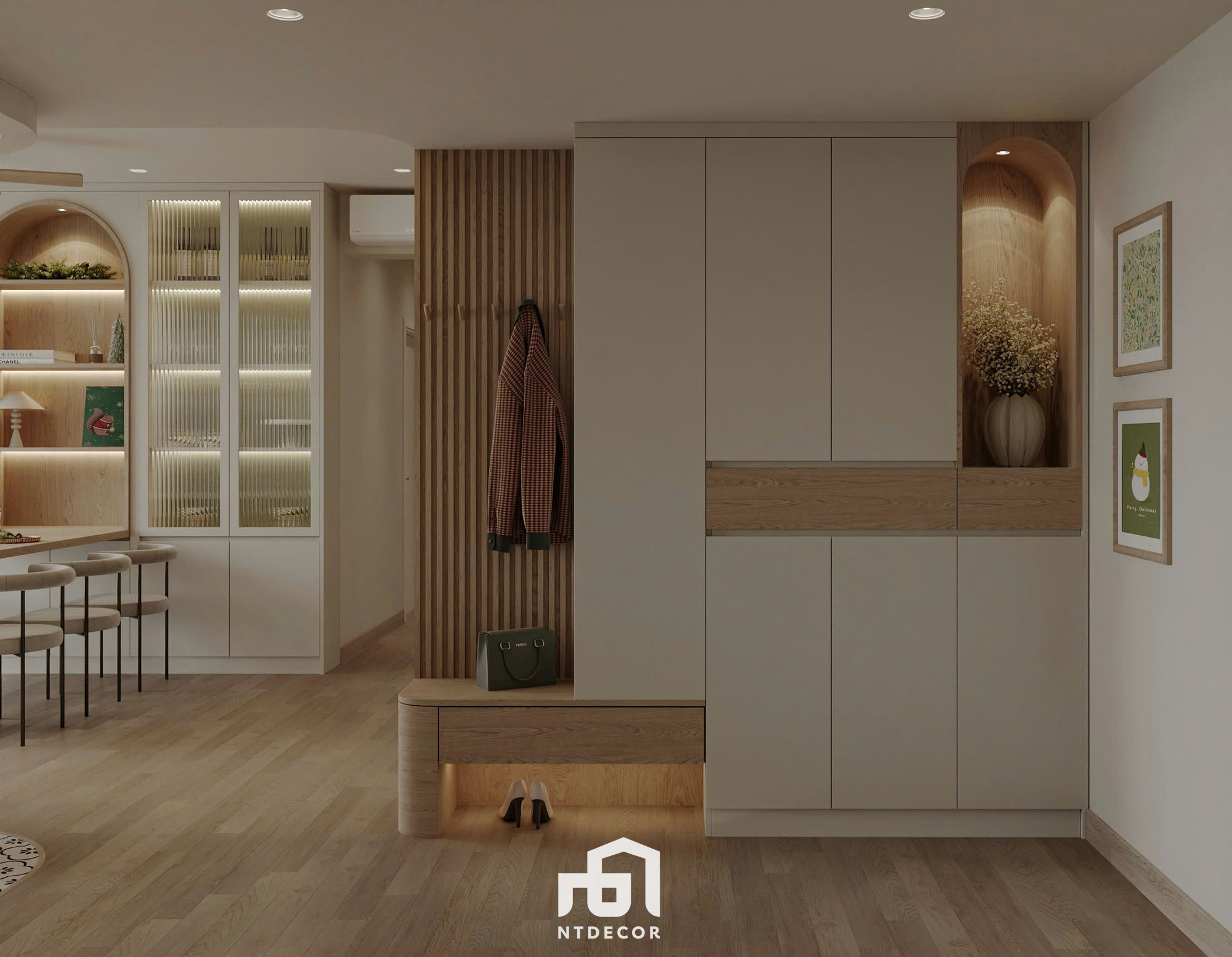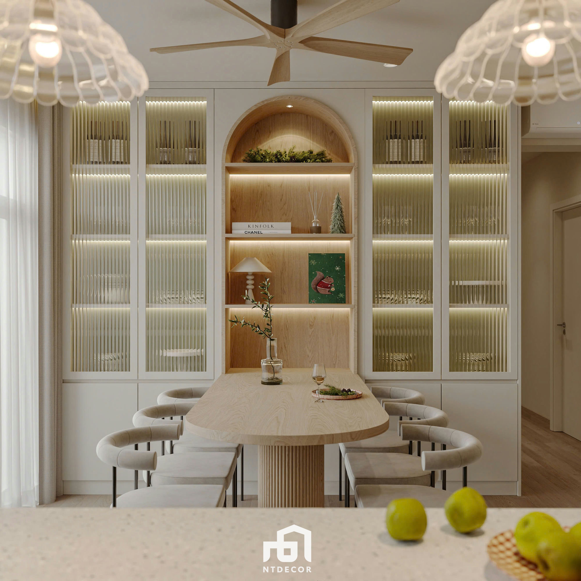 Display Cabinets: A large cabinet system is installed along the wall, featuring doors with fluted glass panels, interspersed with recessed wooden arch niches illuminated by LED strips. This arched detail is not only a striking architectural accent but also creates a sense of depth and classic charm within the room.