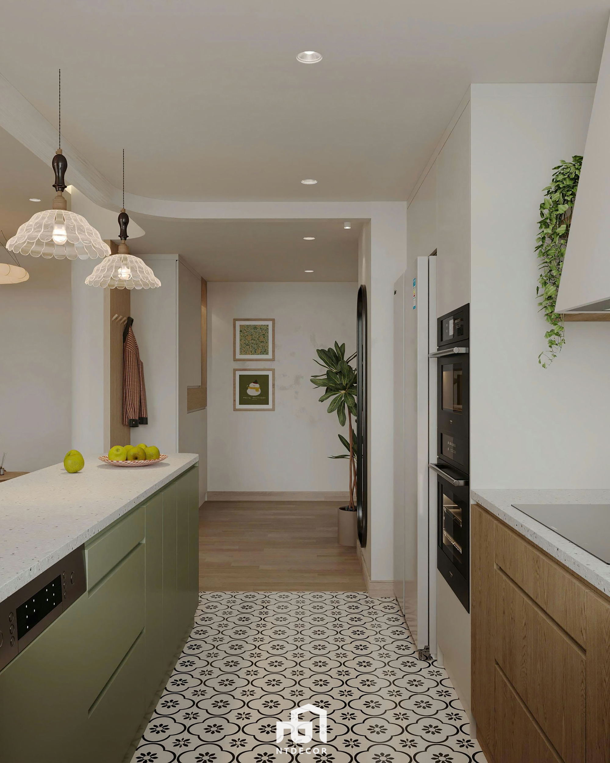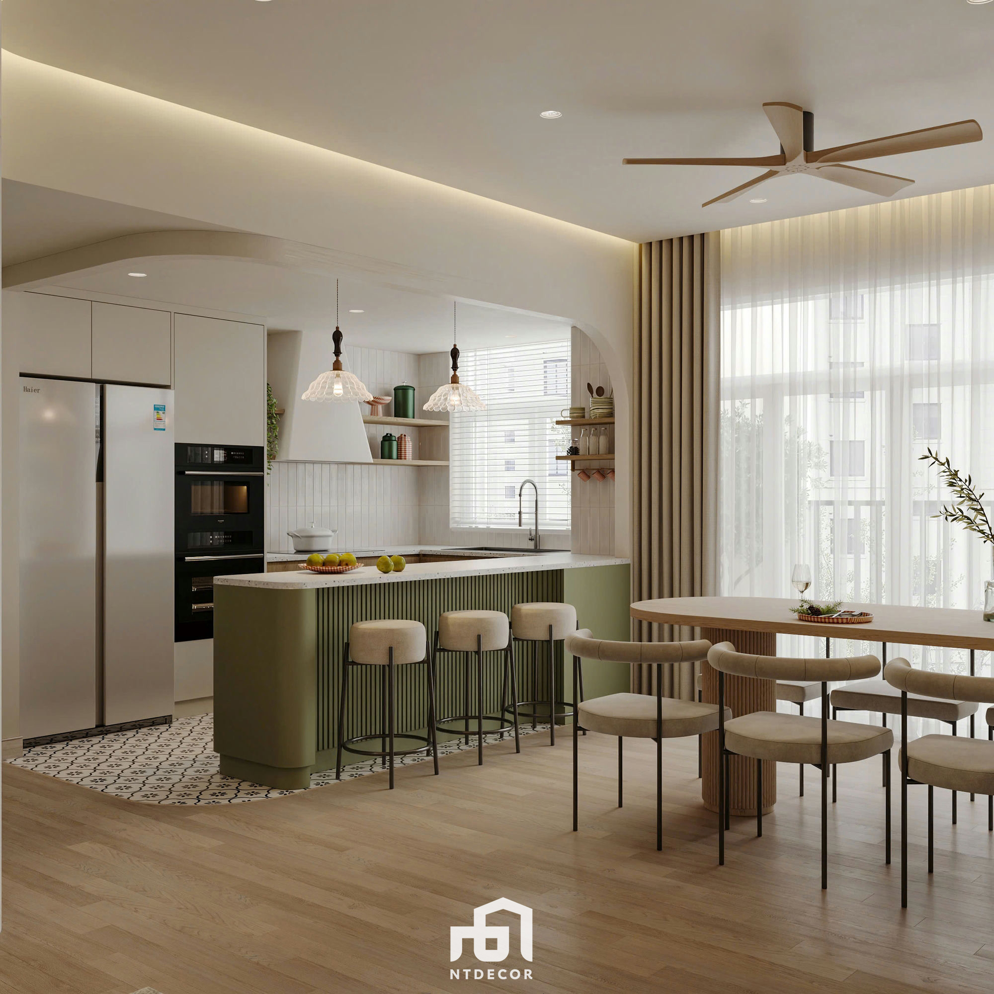 Lighting: The gypsum ceiling integrates cove lighting and downlights, combined with a wooden-bladed ceiling fan and a pair of charming pleated pendant lights over the island, providing warm, layered illumination.