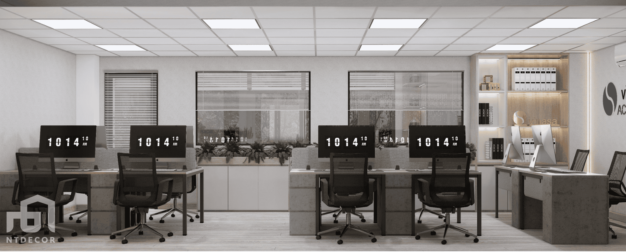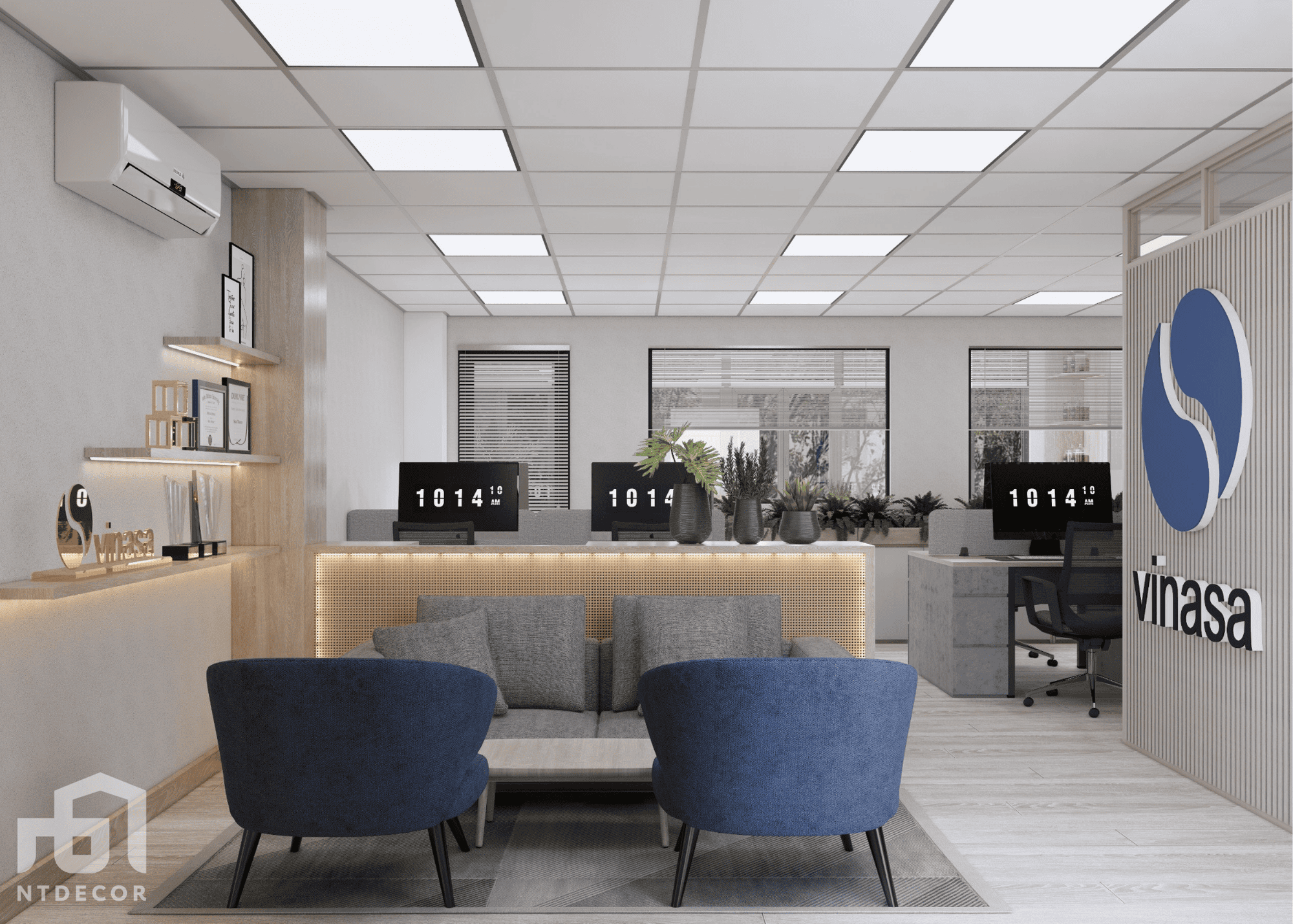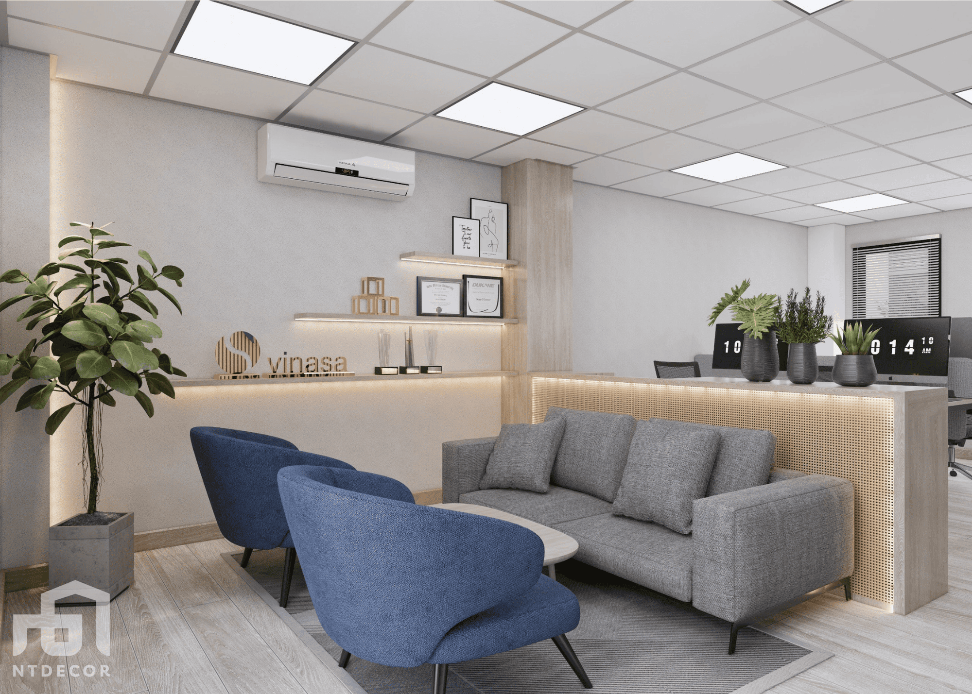 - Gray tones are always a symbol of modernity and minimalism in interior design. For office space, gray creates a delicate, elegant and equally luxurious beauty. Combined with blue accents, Vinasa Office workspace becomes fresh and full of energy, helping to inspire inspiration and creativity for employees.
