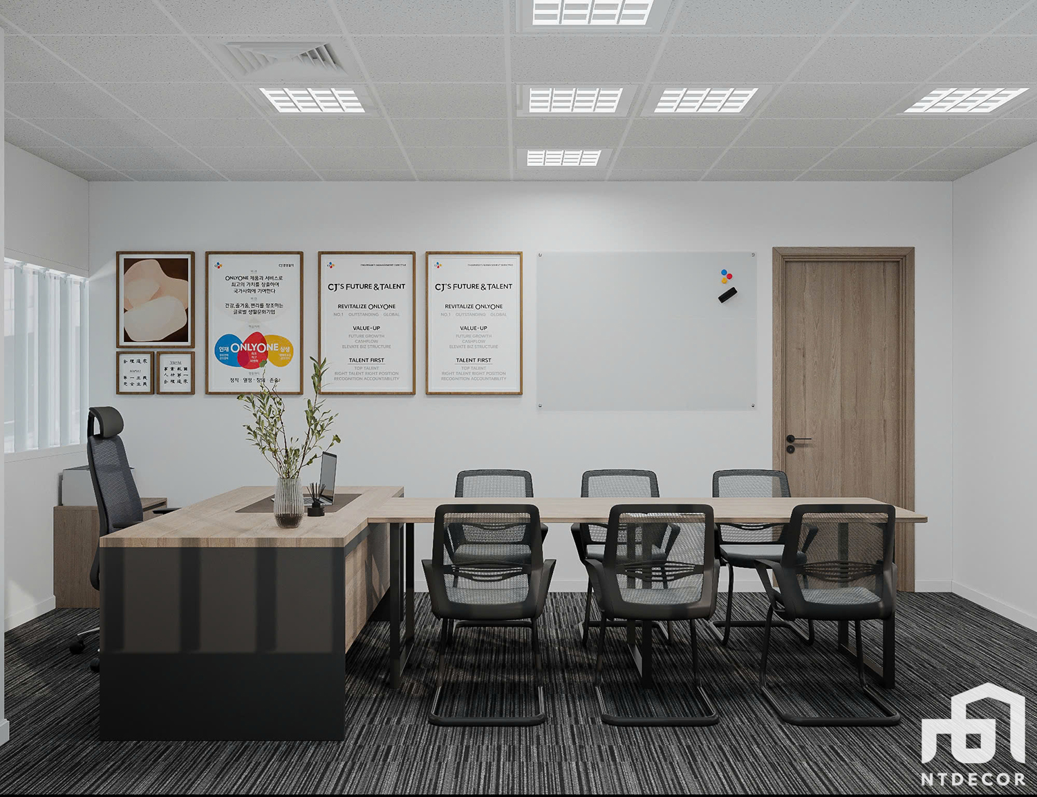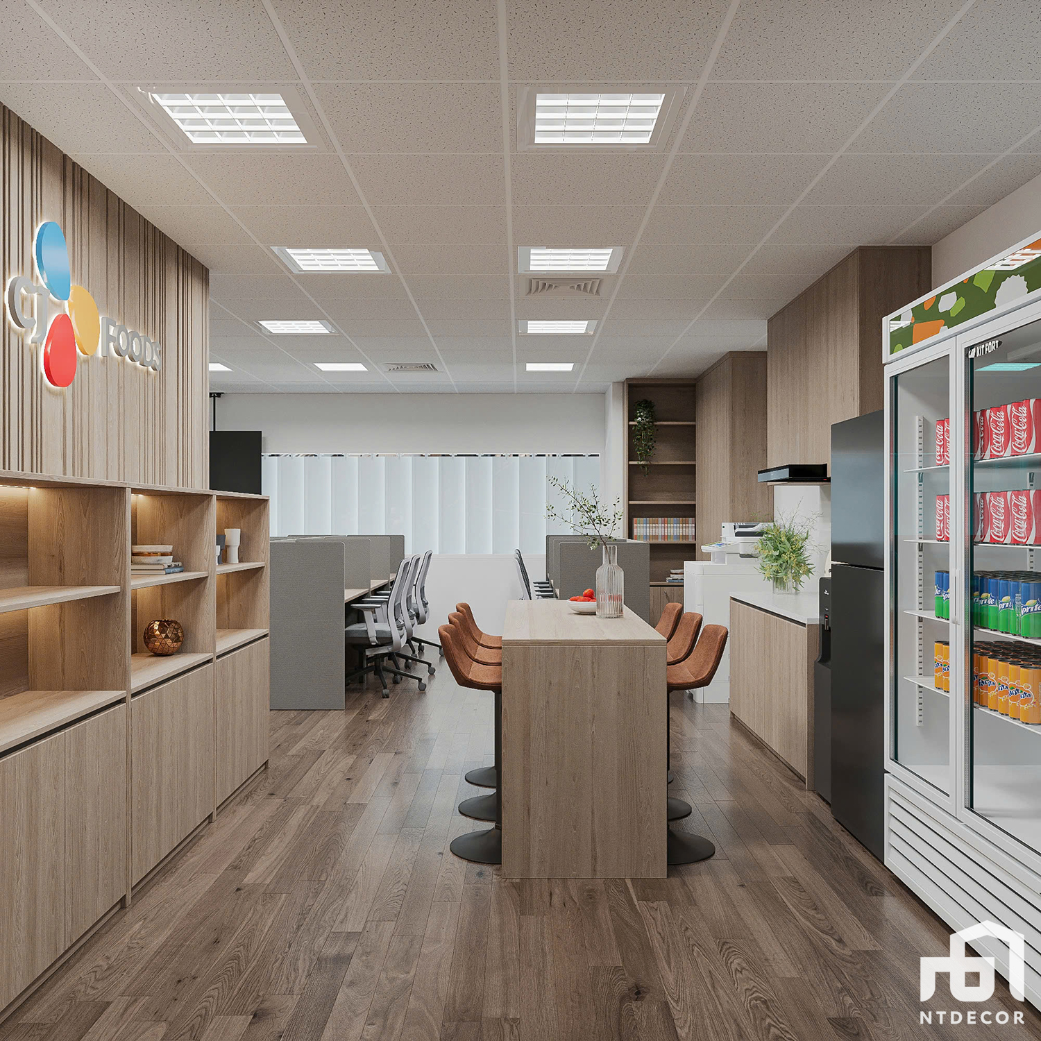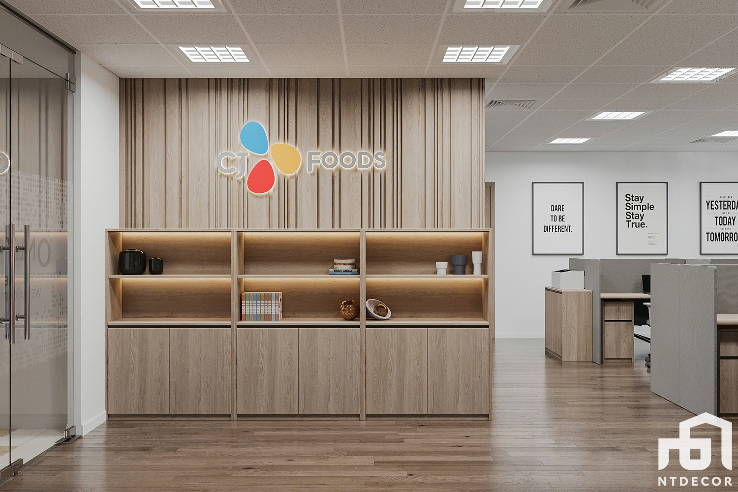 - CJ Foods sử dụng màu trung tính của màu trắng và xám làm màu chính, kết hợp với các tấm gỗ để tạo ra các điểm nổi bật. Đường nét thiết kế rõ ràng, sắc nét tạo nên không gian rộng mở, thoáng đãng.