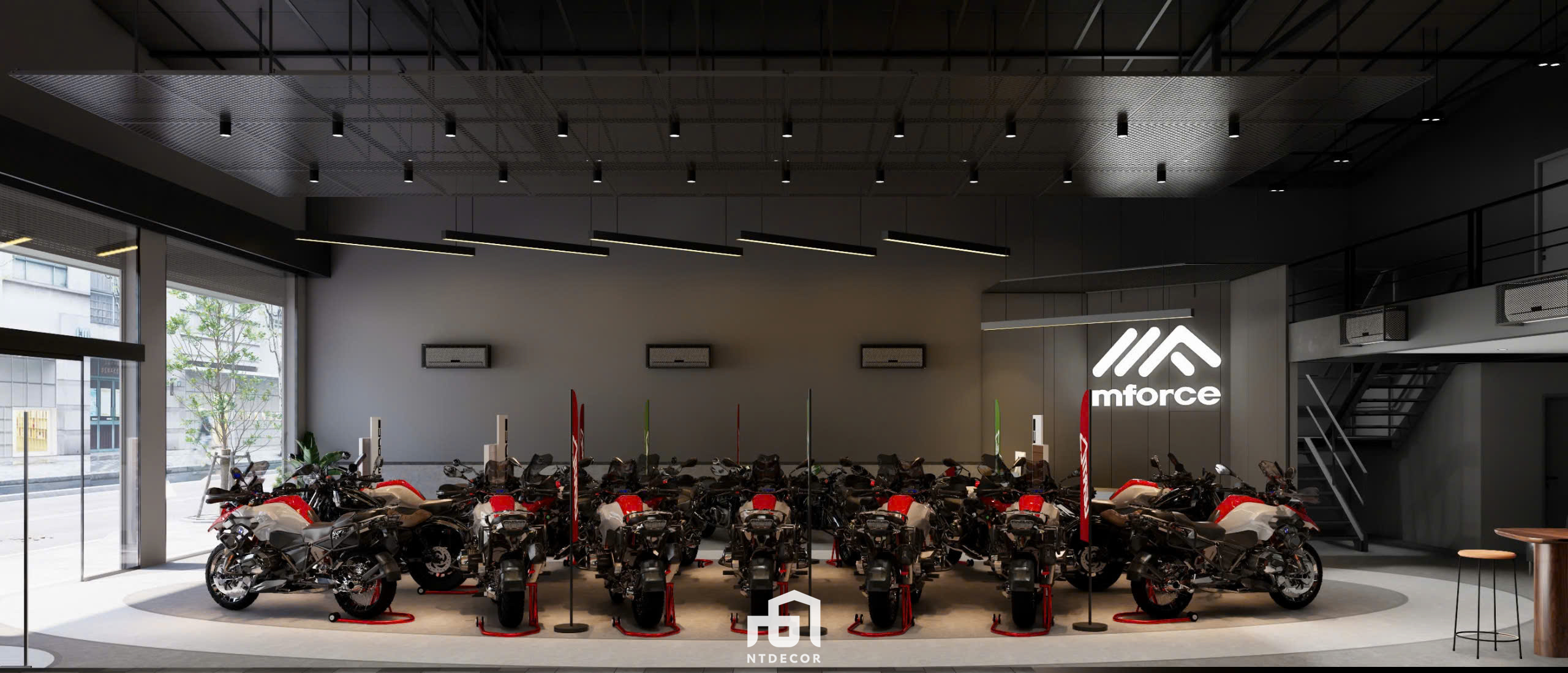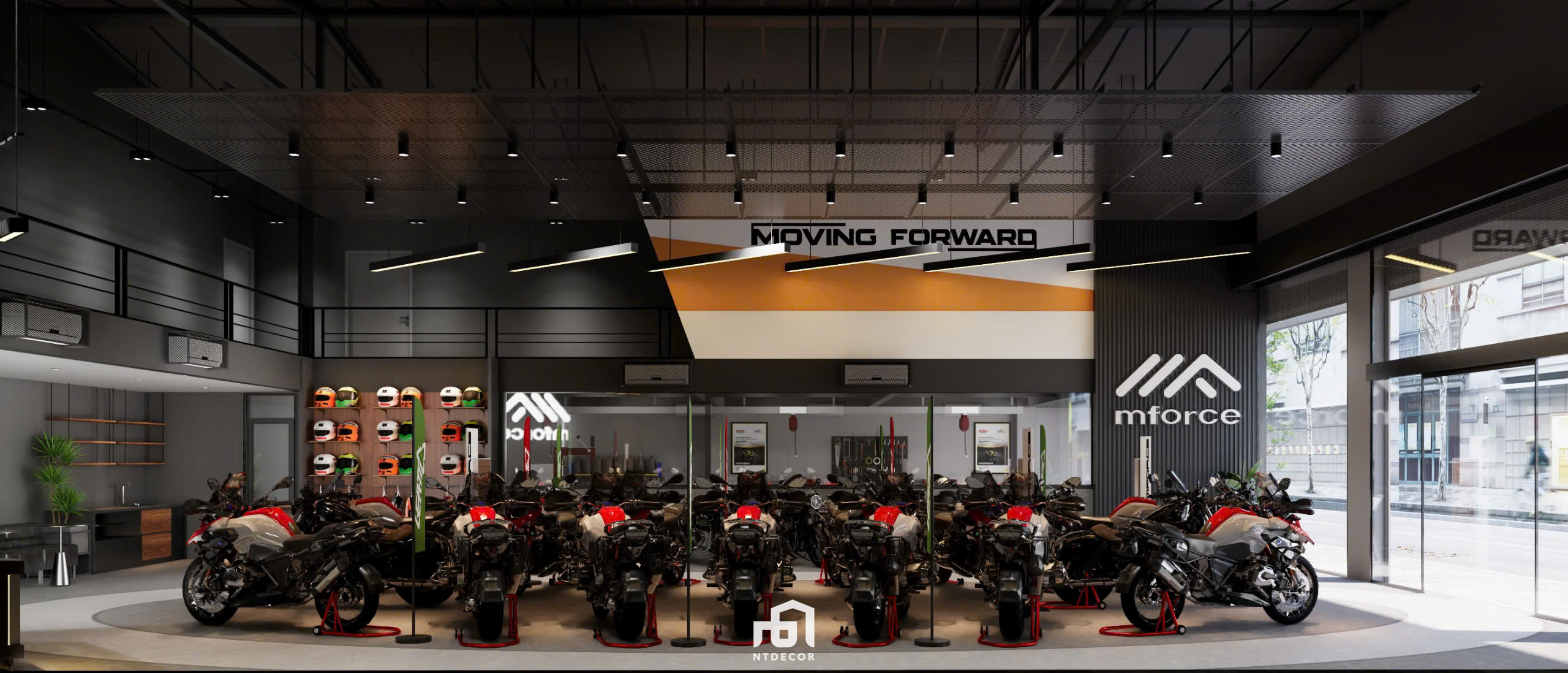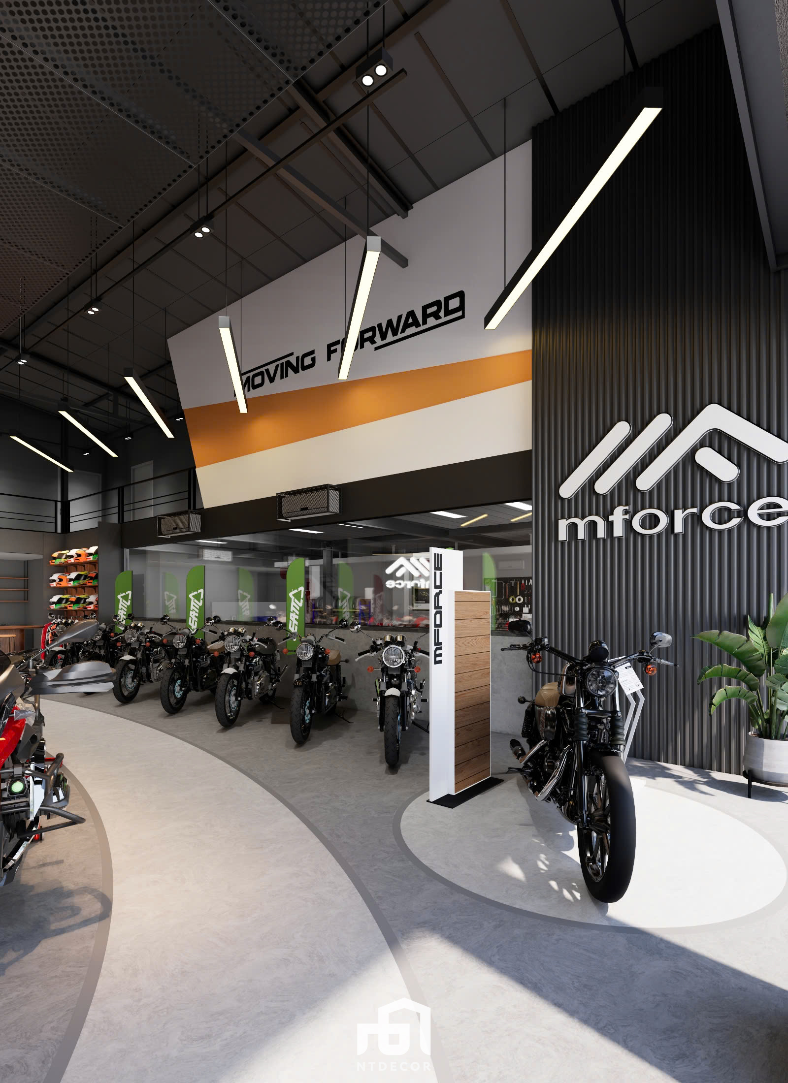 Mforce Vietnam, một thương hiệu đang tạo dấu ấn mạnh mẽ trong lĩnh vực phân phối xe mô tô, đã đặt ra một bài toán đầy thách thức: xây dựng một không gian showroom không chỉ để trưng bày sản phẩm mà còn phải là nơi thể hiện trọn vẹn tinh thần “Moving Forward” – Luôn tiến về phía trước. Dự án thiết kế và thi công showroom Mforce ra đời nhằm hiện thực hóa tầm nhìn đó, tạo nên một điểm đến đẳng cấp, truyền cảm hứng cho cộng đồng yêu xe.